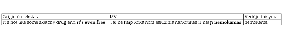 Visus nesuderintų linksnių, skaičiaus, asmens ir giminės atvejus taisė tiek profesionalūs, tiek neprofesionalūs vertėjai, išskyrus vieną eilutę, kurioje netinkamą giminę taisė tik profesionalūs vertėjai. Tikėtina, kad neprofesionalūs vertėjai, taip pat kaip ir MV sistema, neatsižvelgė į platesnį kontekstą, kad sakydama it’s free kalbėtoja kalba vis dar apie anksčiau paminėtą happy pill.