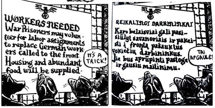 Priėjus prie išvados, kad komiksų šriftas yra svarbus semiotinis elementas, vertėtų atkreipti dėmesį į tai, kaip komikso vertimo tekste formaliai perteiktas originalo šriftas. „Maus“ vertime leidykla išsaugojo pagrindinius naratyvą papildančio teksto elementus. Paties grafinio romano, skyrių ir dalių pavadinimai bei įrašų šriftas grafiškai nebuvo keičiamas, bet pakeistas dialogų teksto šriftas. A. Spiegelmanas komikso tekstą rašė ranka, todėl leidykla turėjo naudoti generinį komiksų šriftą, nes greičiausiai neturėjo techninių galimybių atkartoti autoriaus individualų braižą. Šrifto grafiniai skirtumai matomi 4 pav.