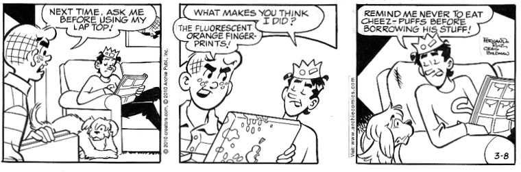 Šiame pavyzdyje komiksą sudaro trys griežta seka išdėstytos iliustracijos (iš kairės į dešinę; kairėje pusėje yra pirmoji mizanscenos dalis, dešinėje – paskutinė). Reikšmė kuriama dvejopai – pasitelkiant ir iliustracijas, ir tekstą. Iliustracijos (veikėjų mimika, objektai, erdvė) sąveikauja su kalbos balionuose (angl. speech bubbles) pateikiamu tekstu, kuris paaiškina iliustracijų prasmę. Verbalinis tekstas ir iliustracijos yra dvi dermės, kuriose reikšmė kuriama pasitelkiant jų sąvoką, todėl akivaizdu, kad komiksas yra multimodalus produktas, o verčiant būtina atsižvelgti į jo multimodalųjį pobūdį. Be to, kuriant reikšmę pasitelkiama ir daugiau vaizdinių modifikacijų, kurios taikomos teksto šriftui, kaip matyti 3 pav.