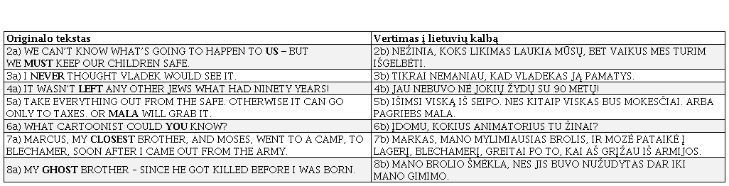 Kai A. Spiegelmanas įrašinėjo savo tėvo pasakojimą, prekybos tinklas „Korvettes“ buvo žinomas kaip pigių prekių parduotuvės. V. Spiegelmano pabrėžiamas taupumas (beveik šykštumas) – tai kultūrinė implikacija, kurią amerikiečiai supranta, tačiau daugeliui lietuvių šio prekybos centro reikšmė greičiausiai nebūtų aktuali, todėl pasirinkimas pavadinimą išskirti tiesiog kabutėmis yra tinkamas. Kita vertus, pasitaikė atvejų, kai paryškintos originalo teksto dalys turėjo akivaizdesnių ir naratyvui svarbesnių implikacijų, kurias praleidus neatskleidžiama pragmatinė reikšmė. 1 lentelėje pateikiama keletas tokių pavyzdžių.