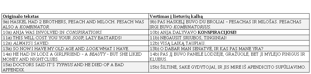 9a ir 9b grafinis perteikimas yra ekvivalentiškas kursyvo vartojimo motyvas – išskirti neįprastą žodį „kombinatorius“, pasiskolintą iš lenkų kalbos, ir reiškiantį asmenį, užsiimantį nelegalia komercine ar panašaus pobūdžio veikla. Anglakalbiam skaitytojui tokia konotacija gali kelti keblumų, nes šio žodžio reikšmė anglų kalba ganėtinai nutolusi nuo V. Spiegelmano intencijos, greičiausiai dėl to žodis ir išskiriamas kursyvu, be to, Dabartinės lietuvių kalbos žodyne pateikta panaši neeksplikuota reikšmė („sukčius“), tad šrifto ekvivalentiškumas padeda geriau atskleisti minėtas asmenines intencijas, o ne žodžio svetimumą.