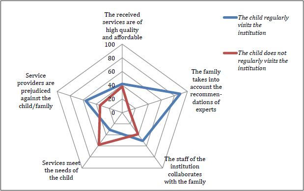 All respondents noted that access to the services and social support is an important factor in the quality of life of a family raising a child with autism. However, the analysis of the survey results demonstrates that more than half of the respondents (61%) indicated that their children regularly visit education, training and rehabilitation services (M = 2.9, SD = 1.2).