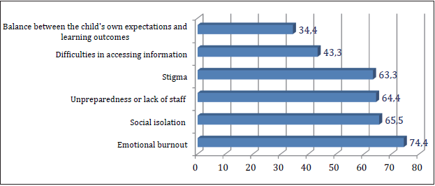Almost two-thirds of the respondents (n=67) noted that they suffer from emotional burnout, which is provoked by low internal or external resources. The correction, reha- bilitation, and development of a child with autism is a difficult niche that requires time and has large financial and psychological costs. Emotional burnout, internal indifference, and acquired hospitalism occur when the level of costs is high while the result on which the resource is concentrated is low. An important factor is the availability of an external resource – social support, which can help cope with life’s challenges.