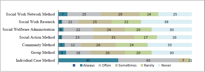 Figure 1 presents social work methods used with individuals having alcohol usage problems. An examination of the percentage expression of baseline scores reveal that social work is the most often based on individual case analysis (45% of respondents reported to use this method “always”), and the least often used methods are social work research (38% “never”) and community method (33% “never”).