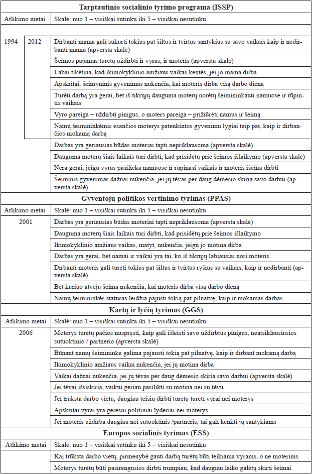 Iš visų analizėje naudojamų tyrimų atrenkami klausimai apie požiūrį į lyčių vaidmenis – vyro, tėvo, motinos, moters vaidmenis šeimoje ir darbo rinkoje, ryšius su vaikais (1 priedas). Atsižvelgiant į klausimų skirtumus tyrimuose, lyginamoji perspektyva – konceptualioji, vertinamas bendras požiūris į lyčių vaidmenis. Gimstamumo dimensijai vertinti naudojamas periodinis suminis gimstamumo rodiklis3.