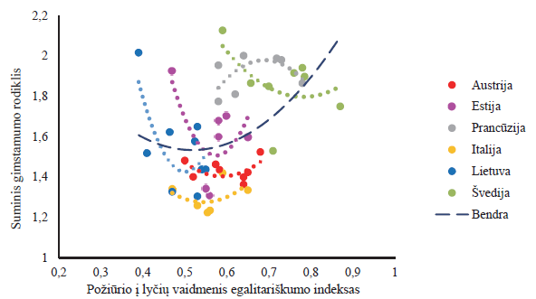 Sąsajos tarp gimstamumo ir lyčių lygiateisiškumo dimensijos įvertintos be prognozavimo pritaikius daugianarę funkciją, atskleidžia bendrą tendenciją tarp šalių ir šalių skirtumus (2 pav.). Visas šalis apimančioje imtyje matomas U formą primenantis požiūrio į lyčių vaidmenis ir gimstamumo ryšys. Nors dėl ryškesnės dešinės pusės forma labiau primena ne U, o J. Tokia forma gali būti susijusi su bendra šalių pažanga žengiant egalitarinių lyčių vaidmenų dominavimo link, kai gimstamumo ir egalitariškumo ryšys tampa teigiamas – didėjant egalitariškumui, didėja ir gimstamumas.