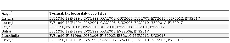 Tyrimų ir kintamųjų atranka. Siekiant atlikti lyginamąją Lietuvos ir kitų šalių analizę, pagrindiniai analizėje naudojamų tyrimų atrankos kriterijai – kiekybiniai, tarptautiniai ir lyginamieji. Analizei atrinkti penki tarptautiniai tyrimai ir devyni duomenų rinkiniai. Tyrimai atlikti 1990–2017 metais (1 lentelė):
