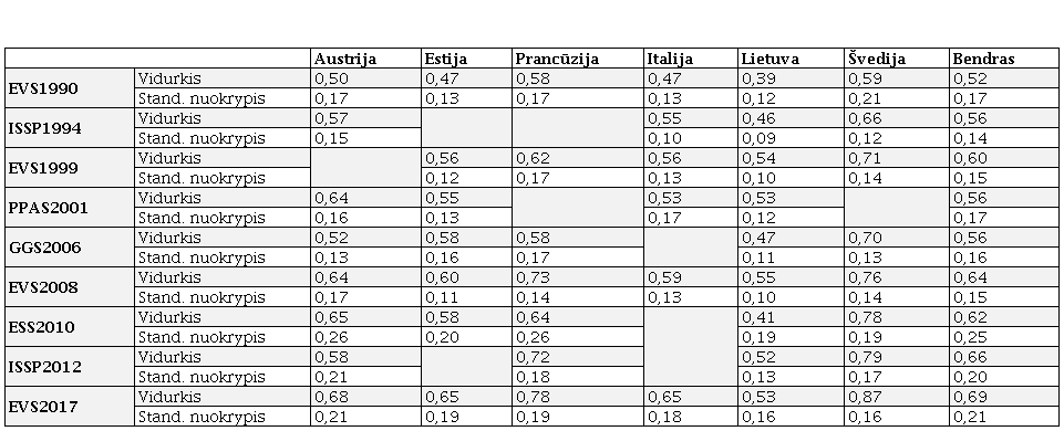 • Tarptautinio socialinio tyrimo programos tyrimas (angl. International social survey programe – ISSP) (ISSP Research Group, 1997, 2016) atliktas 1994 ir 2012 metais.