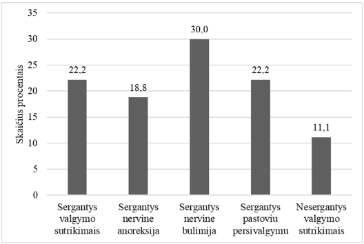 Valgymo sutrikimų grupės 32 tiriamieji serga nervine anoreksija, 20 – nervine bulimija, 9 – persivalgymo sutrikimu, 2 – kita (emocinis valgymas, keli valgymo sutriki- mai). Remiantis papildomos anketos duomenimis, surinkta informacija apie valgymo sutrikimais sergančius asmenis. Šioje grupėje 23 asmenys serga ilgalaikėmis fizinėmis ar psichikos ligomis. Respondentų vidutinis sergamumas valgymo sutrikimais yra 6 metai (M = 6,25, SD = 6,27), o vidutinė viso gydymosi trukmė kiek daugiau nei 53 savaitės (M = 53,54, SD = 113,09). Jie yra naudoję įvairius gydymosi būdus – stacionarus gy- dymas (n = 45), dienos stacionaras (n = 26), lankymasis pas psichologą, psichoterapeu- tą (n = 46), psichiatro konsultacijos (n = 31), psichoterapinės ar savipagalbos grupės (n = 31), medikamentai (n = 25), dvasinė pagalba (n = 10), kita (n = 8). Tiriamieji, vertindami, kiek tai, kad jie serga valgymo sutrikimu, yra susiję su jų savižudybės rizika, vidutiniškai tam skyrė 2 balus iš 5 (0 – visai nesusiję, 5 – labai susiję).