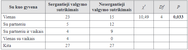 Siekiant detalesnio valgymo sutrikimais sergančių ir šiais sutrikimais nesergančių grupių tarpusavio lyginimo, pirmiausiai palyginta, ar grupės skiriasi pagrindinėmis demo- grafinėmis charakteristikomis. Grupės pagal lytį ir gyvenamąją vietą buvo identiškos, tad jas lyginti pagal šiuos aspektus nebuvo tikslinga. Toliau grupės lygintos pagal kitus demografinius ypatumus, naudojant Chi kvadrato homogeniškumo kriterijų. Nustatyta, kad sergantys valgymo sutrikimais ir nesergantys valgymo sutrikimais asmenys tarpusavyje reikšmingai nesiskyrė pagal išsilavinimą (p > 0, 933). Reikšmingų skirtumų taip pat nepastebėta, lyginant šias grupes pagal vidutinį amžių (sergančių valgymo sutrikimais: M = 25,93, SD = 7,14; nesergančių valgymo sutrikimais: M = 25,02, SD = 6,87, p = 0,495). Visgi pagal tai, su kuo gyvena, grupės reikšmingai skyrėsi (p = 0,033). Valgymo sutrikimais sergantys asmenys dažniau gyvena vieni arba vieni su vaikais ir rečiau su partneriu ar partneriu ir vaikais nei šiais sutrikimais nesergantys asmenys (žr. 1 lentelę). Nepaisant to, šias grupes galima teigti esant pakankamai panašias pagrindinėmis demografinėmis ypatybėmis, kad jas būtų galima toliau lyginti.