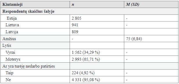 SHARE tyrime apklausiami 50 metų ir vyresni asmenys bei jų sutuoktiniai / partneriai. Iš viso 7-tos bangos tyrime dalyvavo 5 116 asmenų iš Estijos, 2 035 asmenys iš Lietuvos, 1 734 – iš Latvijos, kurie kiekvienoje šalyje buvo atrinkti atsitiktinės atrankos metodu. Atsižvelgiant į tyrimo tikslą, tyrimui buvo atrinkti tik tie asmenys, kuriems jau buvo suėję 65 metai. Iš tyrimo taip pat buvo pašalinti duomenys, kuriuose buvo praleistų reikšmių. Galutinę tyrimo imtį sudarė 4 555 asmenys, informacija apie juos pateikiama 1 lentelėje.