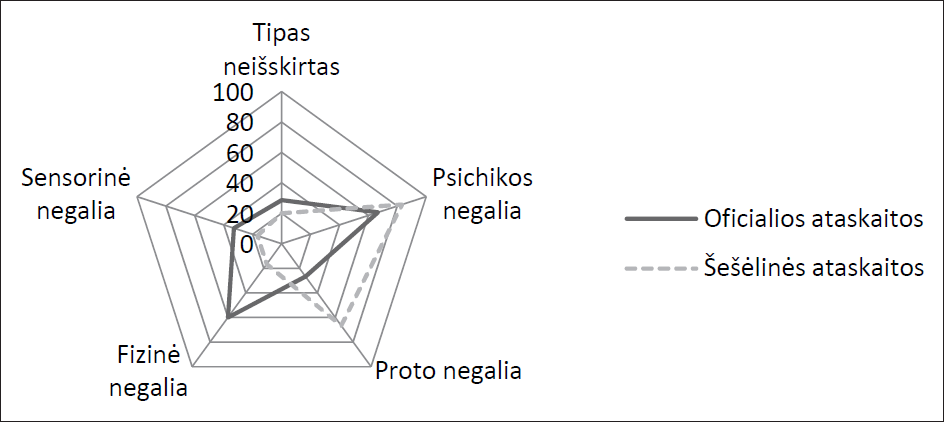 Atliekant analizę, visų pirma buvo siekiama pasižiūrėti, kokios specifinės negalios grupės yra išskiriamos tiek oficialiose, tiek šešėlinėse ataskaitose, nes kalbant apie konkrečių paslaugų ir priemonių taikymą praktikoje yra reikalingi specifinės negalios poreikiai. Tyrimo duomenimis, 28,6 proc. oficialių ataskaitų ir 20 proc. šešėlinių ataskaitų negalios tipas nėra išskirtas, todėl nėra pakankamai duomenų įvertinti, ar visose šalyse yra vertinama stacionarių globos institucijų problematika ir reformos poreikis. Pereinant prie konkrečios negalios, abiem atvejais daugiausia dėmesio buvo skirta psichikos negaliai (66,7 proc. oficialių ir 83,3 proc. šešėlinių ataskaitų) (žr. 1 pav.). Toliau dėmesys skyrėsi: oficialiose ataskaitose nemažai dėmesio buvo skiriama fizinei negaliai (60 proc.), o šešėlinėse ataskaitose intelekto (66,7 proc.) negaliai. Matyti, kad viešosios paskirties pastatų pritaikymas fizinę negalią turintiems asmenims tapo valstybių „pasiteisinimu“ dėl Konvencijos įgyvendinimo. Alternatyviose ataskaitose tolygiai (16,7 proc.) mažai dėmesio skiriama tiek fizinei, tiek jutiminei (pvz., klausos, regos) negaliai, todėl galima daryti prielaidą, kad daugiausia pažeidimų neįgaliuosius vienijančios organizacijos nustato būtent dėl sąlygų, kurias patiria žmonės, turintys proto ir (ar) psichikos negalią.