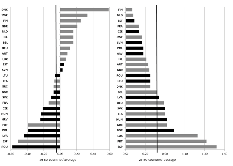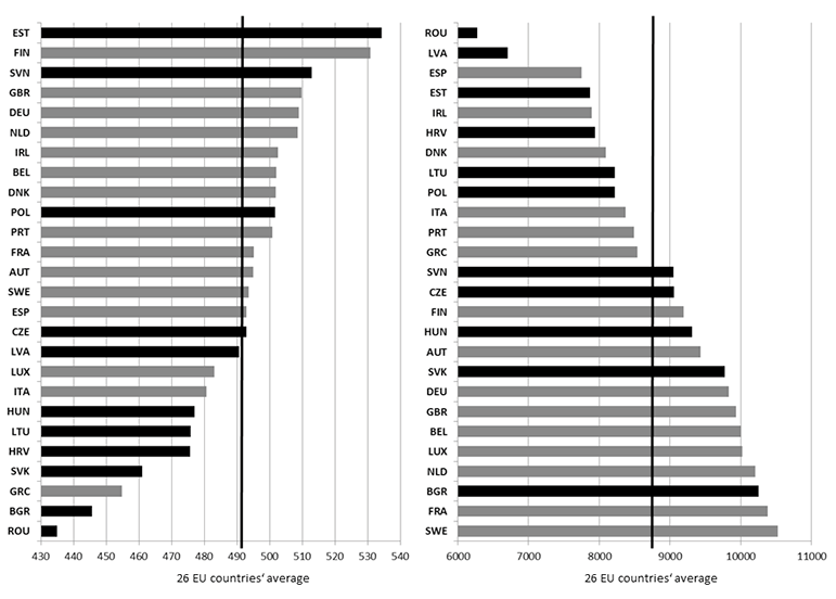In respect to ESCS, Scandinavian countries have the highest index, and Romania is on the lowest level among the 26 EU member states (Figure 2). National variances indicate that students’ environments are heterogeneous in terms of parental occupation, education, and home welfare in new member states as well as in “old” EU countries. Bulgaria is experiencing a high variance of ESCS, indicating wide social disparities within the population, while Estonia has the lowest variance.
