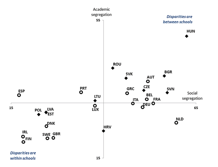 The first part of our analysis is dedicated to inequalities in educational achievement (academic segregation) and inequalities in socio-economic status (social segregation) for European countries. Academic segregation can be measured as a between-schools variance of student achievement, and social segregation can be measured as a between-schools variance of students’ socio-economic status.