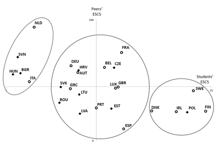 As we can see in Figure 6, the countries (post-socialist countries are marked using diamond shapes) are scattered according students’ and peers’ socio-economic statuses. We can identify three groups: the group in the left, with a high peer and low student effect, the group in the right, with a low peer and high student effect, and the biggest group in the middle, with an average peer and student effect. Poland is close to Scandinavian countries and Ireland, for which the students’ ESCS component is the largest comparing to other countries. Denmark, Ireland, Poland, and Finland have almost equal peers’ ESCS estimates and only the students’ ESCS part discriminates among the countries. On the opposite side of the chart there are countries like Slovenia, Hungary, and Bulgaria, which look similar to Italy. The Netherlands and Spain are different from all other EU countries and hold positions at the opposites of the scale – the biggest score of the peers’ effect is in the Netherlands, while Spain has the smallest score of the peers’ effect.