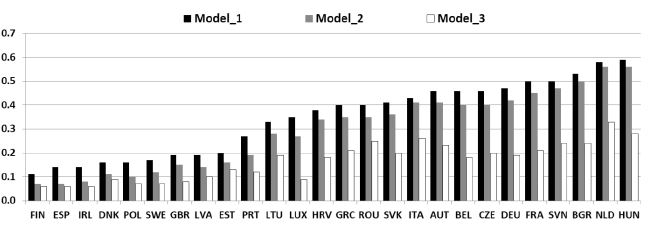 We started our analysis by running an empty model (Model_1) and decomposing the total variance of student performance to between- and within-school variance. The intra-class correlation (ICC) indicates which share of variance is due to between school differences. From Figure 5 one can see that there is a broad range of values across countries—from 11% for schools in Finland to 59% for the schools in Hungary. On average 38% of the variance in science achievement can be attributed to schools in new EU countries (32% in “old” member states and 35% in 26 EU countries).