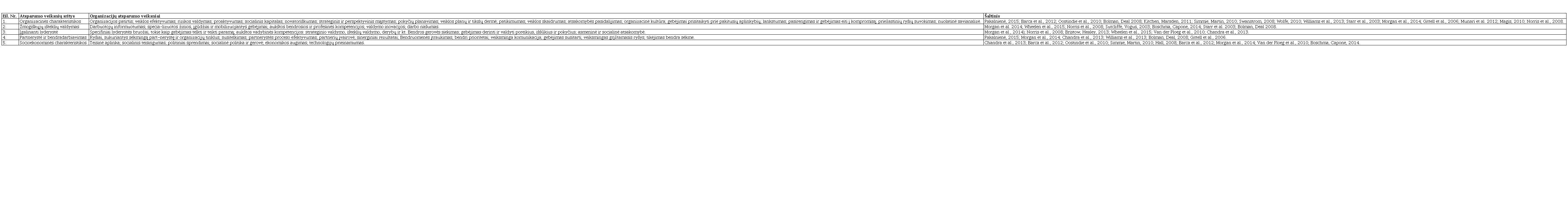 Apibendrinant tai, kas pasakyta, organizacijų atsparumo veiksnius galima sugrupuoti, skiriant organizacinių, žmonių išteklių valdymo, lyderystės, bendradarbiavimo ir išorinės aplinkos veiksnių grupes (1 lentelė).