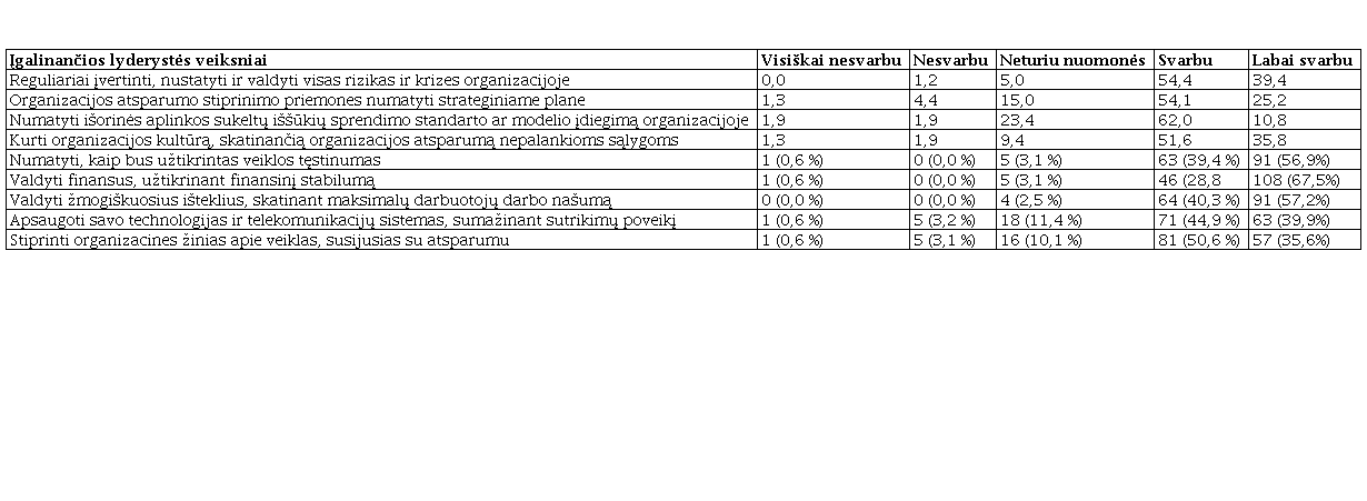 Kaip matyti iš lentelės, respondentai mano, kad vieni iš svarbiausių veiksnių yra finansų valdymas, užtikrinant organizacijos finansinį stabilumą; žmogiškųjų išteklių valdymas, skatinant maksimalų darbuotojų darbo našumą, ir veiklos tęstinumo užtikrinimo numatymas. Kaip vidutiniškai svarbius veiksnius respondentai įvardija organizacijos technologijų ir telekomunikacijų sistemų apsaugą, sumažinant sutrikimų poveikį; reguliarų visų rizikų (krizių) organizacijoje įvertinimą, nustatymą ir valdymą; organizacijų kultūros, skatinančios organizacijos atsparumą nepalankioms sąlygoms, kūrimą bei organizacinių žinių apie veiklas, susijusias su atsparumu, stiprinimą.