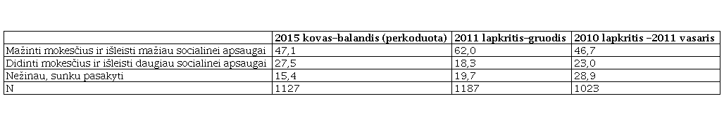 Kita vertus, analizuojant tęstinių apklausų duomenis pastebima, kad ir priskirdama valstybei daug atsakomybės už IGS (ir socialinę politiką apskritai), Lietuvos visuomenė nėra linkusi pripažinti poreikio didinti mokesčius ir išleisti daugiau socialinei apsaugai (žr. 1 lentelę). Reikia pažymėti, kad tolydžio mažėjanti, bet vis tiek didelė dalis Lietuvos gyventojų (2015 m. apie šeštadalį) neturėjo nuomonės šiuo klausimu. Taigi daugumos gyventojų nuostata sutampa (atkartoja) su dominuojančia Lietuvos politinio elito neoliberaliąja nuostata, kad reikia mažinti mokesčius ir išleisti mažiau socialinei apsaugai (Gudžinskas, 2014).
