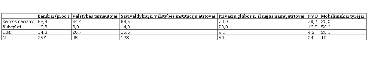 Tyrimo rezultatai. Toliau pateikiamos aprašomąja statistika pagrįstos IGS teikėjų apklausos rezultatų įžvalgos, susijusios su jų socialinėmis ir politinėmis orientacijomis. Absoliuti dauguma (daugiau negu du trečdaliai) IGS teikėjų pareigą rūpintis senyvo amžiaus asmenimis priskiria šeimos nariams, valstybei tenka esminė atsakomybė už IGS tik mokslininkų tyrėjų nuomone (žr. 2 lentelę). Mažiausiai valstybei priskirti IGS atsakomybę yra linkę valstybės tarnautojai, kurie, beje, daugiau negu kitos IGS teikėjų kategorijos nurodė, kad rūpintis senyvo amžiaus žmonėmis turėtų „kita“ (privačios įstaigos, religinės bendruomenės, nevyriausybinės organizacijos).