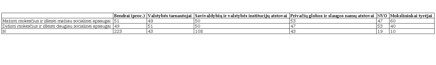 IGS teikėjų požiūris į mokesčių politiką ir socialinės apsaugos finansavimą reikšmingai skiriasi nuo pirmiau aptarto Lietuvos politinio elito ir gyventojų požiūrio: pastaruoju atveju neoliberaliosios nuostatos mažinti mokesčius ir išleisti mažiau socialinei apsaugai dominuoja tik mokslininkų tyrėjų tarpe, o kiti respondentai yra maždaug tolygiai pasidaliję tarp dviejų vertybinių pasirinkimų (žr. 4 lentelę). Tarp valstybės tarnautojų ir NVO atstovų persvarą (nors ir nedidelę) turi pasisakantieji už mokesčių didinimą ir daugiau finansų skyrimą socialinei apsaugai.