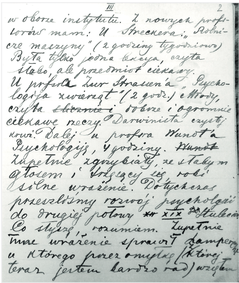 „Dar [mokausi] pas prof. Wundtą 4 valandas. Wundtas visai susenęs, silpnu balsu, kretantis, daro stiprų įspūdį. Iki šiol išėjome psichologijos vystymąsi iki antrosios XIX amžiaus pusės. Ką nugirstu, suprantu.“7