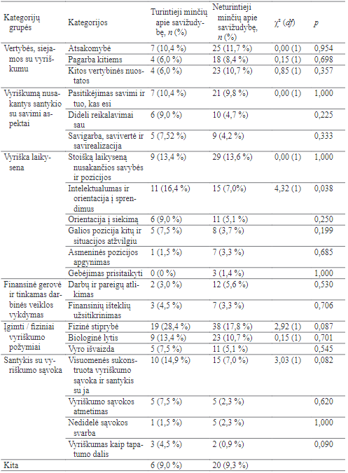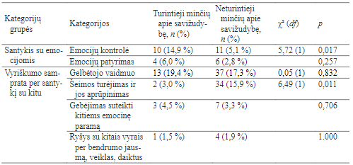 Turinčiųjų ir neturinčiųjų minčių apie savižudybę grupės skyrėsi trimis kategorijomis, apibūdinančiomis vyriškumą (2-a lentelė). Turintiesiems minčių apie savižudybę vyrams buvo labiau būdinga vyriškumą sieti su emocijų kontrole (χ² = 5,72, df = 1, p = 0,017, turinčiųjų minčių grupėje 14,9 %, neturinčiųjų – 5,1 %) bei intelektualumu ir orientacija į sprendimus (χ² = 4,32 , df = 1, p = 0,038, turinčiųjų minčių grupėje 16,4 %, neturinčių- jų – 7,0 %). Neturintiems minčių apie savižudybę vyrams buvo labiau būdinga vyriškumą sieti su šeimos turėjimu ir aprūpinimu (χ² = 6,49, df = 1, p = 0,011, neturinčiųjų minčių grupėje 15,9 %, turinčiųjų – 3,0 %).