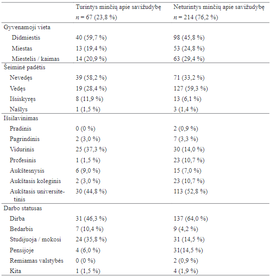 Tyrimo dalyvių amžius svyruoja nuo 19 iki 92 metų (M = 42,95; SD = 17,85). Pagal Savižudiškų minčių intensyvumo skalės įverčius, 67 (23,8 %) vyrai turėjo minčių apie savižudybę, o 214 (76,2 %) vyrų neturėjo minčių apie savižudybę. Detalesnės šių grupių demografinės charakteristikos pateikiamos 1-oje lentelėje.