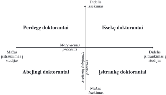 „Perdegę“ doktorantai (būdingas mažas įsitraukimas į studijas ir didelis išsekimas).