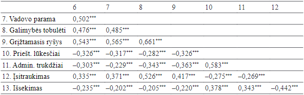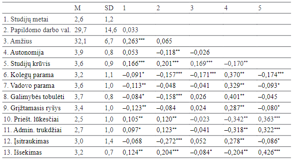 Intervalinio tipo kintamųjų vidurkiai, standartiniai nuokrypiai ir tarpusavio koreliacijos yra pateikiami 1-oje lentelėje. Kaip ir buvo tikėtasi, įsitraukimas į studijas buvo labiausiai susijęs su tokiais studijų ištekliais kaip autonomija, vadovų ir kolegų parama, galimybės tobulėti bei grįžtamasis ryšys. Išsekimas buvo labiausiai susijęs su tokiais studijų reika- lavimais kaip studijų krūvis, vaidmens prieštaros ir administraciniai trukdžiai.