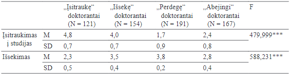 Kaip matyti iš 2-os lentelės rezultatų, buvo išskirtos keturios doktorantų gerovės grupės, kurios atitinka teorinėje šio straipsnio dalyje keltas prielaidas. „Įsitraukusių“ doktorantų grupė pasižymėjo didžiausiu įsitraukimu į studijas ir mažiausiu išsekimu, tačiau buvo pati mažiausia. „Išsekusių“ doktorantų grupė pasižymėjo santykinai dideliais įsitraukimo į studijas ir išsekimo rodikliais. „Perdegusių“ doktorantų grupei buvo būdingas mažiausias įsitraukimas į studijas ir didžiausias išsekimas. Ši grupė taip pat buvo pati gausiausia, jos išsekimo įverčių sklaida glaudžiausiai susitelkusi apie vidurkį, o pats vidurkis itin priartėjęs prie maksimalios skalės reikšmės (t. y. 4). „Abejingų“ doktorantų grupei buvo būdingas santykinai mažas įsitraukimas į studijas ir išsekimas. Anova Fisher kriterijus atskleidė, kad grupės reikšmingai skiriasi tarpusavyje pagal vertintus gerovės rodiklius, o Bonfer- roni post hoc testas patvirtino, kad visi skirtumai tarp grupių yra statistiškai reikšmingi.