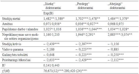 Siekiant įvertinti, kokie kintamieji geriausiai prognozuoja priklausymą skirtingoms gerovės grupėms, buvo atlikta dviejų etapų daugialypė logistinė regresinė analizė. Jos rezultatai (3-ia lentelė) atskleidė, kad iš šiame tyrime vertintų demografinių ypatybių priklausymą skirtingoms grupėms reikšmingai prognozavo tik studijų metai, tiriamojo amžius, su studijomis nesusijusio darbo valandos bei nepriklausymas savo mokslo srities organizacijoms. Su kiekvienais studijų metais nuo 48 iki 70 % didėja tikimybė, kad doktorantas priklausys kuriai nors iš mažesne gerove pasižyminčių doktorantų grupių. Savo mokslo sritį vienijančioms organizacijoms nepriklausantys tiriamieji buvo apie du kartus labiau linkę priklausyti „perdegusių“ ir apie tris kartus labiau – „abejingų“ dok- torantų grupėms. Ilgesnės su studijomis nesusijusio darbo valandos ir jaunesnis amžius taip pat šiek tiek mažino tikimybę priklausyti „įsitraukusių“ doktorantų grupei. Kalbant apie demografinius skirtumus, svarbu atkreipti dėmesį į jų santykinę prognozinę reikšmę. Palyginus pirmojo (kai prognoziniai kintamieji – tik demografinės ypatybės) ir antrojo analizės etapo rezultatus matyti, kad pseudodeterminacijos koeficientas (R2) tarp etapų padidėjo daugiau nei tris kartus. Tai rodo, kad su studijų aplinka susijusių charakteristikų įtraukimas gerokai pagerino regresinės lygties prognozines galimybes, todėl doktorantų gerovės prielaidų verta ieškoti pirmiausia jų studijų sąlygose.
