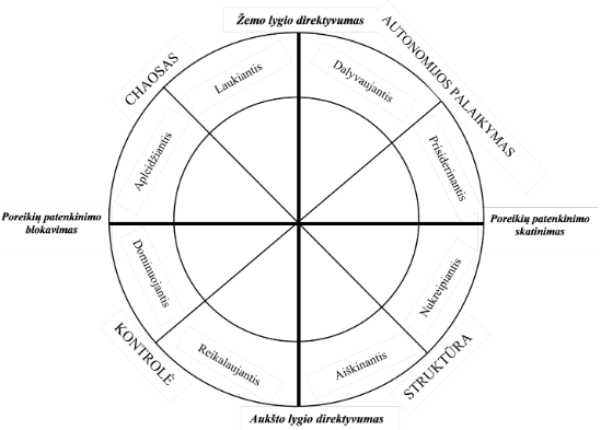 Siekiant suprasti mokytojų bendravimo su mokiniais naudą arba žalą mokiniams, tyrimuose analizuojami tiek autonomiją palaikančio, struktūruojančio, kontroliuojančio ir chaotiško bendravimo stilių, tiek jiems būdingų praktikų (pavyzdžiui, pasirinkimų suteikimas, gąsdinimas pasekmėmis; konstruktyvaus grįžtamojo ryšio teikimas, pamokų planavimas) veiksmingumas. Tačiau šiuose tyrimuose yra vadovaujamasi kategoriniu požiūriu: stiliai ir praktikos vertinami kaip mokinių poreikius tenkinantys arba blokuojantys, ir neatsižvelgiama, kiek stipriai jie poreikius tenkina ar blokuoja (Aelterman et al., 2019). Belgijos Gento universiteto mokslininkai (Aelterman et al., 2019) pasiūlė naują būdą analizuoti (ne)motyvuojančius mokytojų bendravimo stilius – Žiedinį modelį (angl. Cir- cumplex model). Tai integruotas požiūris, kuriuo vadovaujantis keturi (ne)motyvuojantys mokytojų bendravimo stiliai (autonomijos palaikymas, struktūros suteikimas, kontrolė ir chaosas) yra analizuojami kartu, atsižvelgiant į jų panašumus ir tarpusavio ryšius dviejų dimensijų – esminių psichologinių poreikių patenkinimo ir blokavimo bei aukšto ir žemo lygio direktyvumo – atžvilgiu (žr. 1-ą pav.). Kiekvienam mokytojų bendravimo stiliui būdingi du savitesni bendravimo būdai (Vansteenkiste et al., 2019; Aelterman et al., 2019).