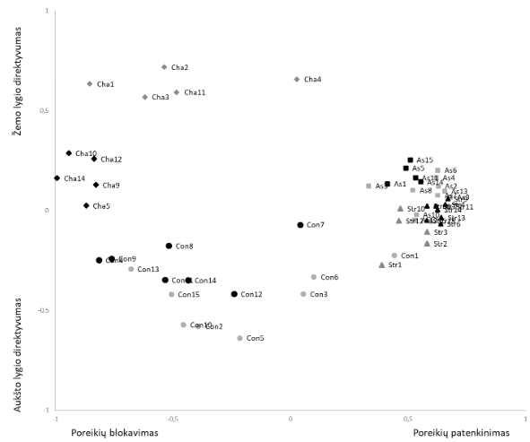 Dviejų dimensijų reprezentacijos (2-as pav.) horizontali x ašis (pirmoji dimensija) atspindi poreikių patenkinimo–poreikių blokavimo kontinuumą, kuriame kontroliuojančio ir chaotiško stilių koordinatės neigiamos, o autonomiją palaikančio ir struktūruojančio – teigiamos. Vertikali y ašis (antroji dimensija) gali būti interpretuojama kaip mokytojo aukšto ir žemo lygio direktyvumas. Šioje dimensijoje chaotiškas ir autonomiją palaikantis stilius turi teigiamas koordinates, o kontroliuojantis ir struktūruojantis – neigiamas. Pagal teiginių išsidėstymą galima identifikuoti keturis dviejų statmenų ašių erdvinės plokštumos ketvirčius, iš esmės atitinkančius teorinius bendravimo stilius. Dauguma struktūruojančio bendravimo stiliaus teiginių yra apatiniame dešiniajame (kurį nusako poreikių patenkinimas ir aukšto lygio direktyvumas) ketvirtyje, dauguma autonomiją palaikančio stiliaus teiginių – viršutiniame dešiniajame ketvirtyje (poreikių patenkinimas ir žemo lygio di- rektyvumas), dauguma kontroliuojančio stiliaus teiginių išsidėstę apatiniame kairiajame ketvirtyje (poreikių blokavimas ir aukšto lygio direktyvumas), o dauguma chaotiško stiliaus teiginių – kairiajame viršutiniame ketvirtyje (poreikių blokavimas ir žemo lygio direktyvumas). Reikia pažymėti, kad autonomiją palaikančio ir struktūruojančio stilių teiginiai yra labai arti, t. y. mokinių suvokiami kaip labai panašūs. Vienas kontroliuojančio bendravimo stiliaus teiginys Con1 („Pakabina taisykles klasėje. Pasako, kad jūs turite jų laikytis. Nurodo, kas gresia už taisyklių nesilaikymą“) yra artimesnis struktūruojančio stiliaus teiginiams nei kitiems kontroliuojančio stiliaus teiginiams.