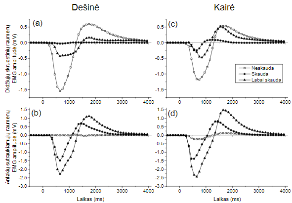 Lygindami EMG reakcijas, gautas dešinėje ir kairėje veido pusėje, matome panašius formos ir kaitos laike dėsningumus. Atpažįstant ir nutaisant veido išraišką „neskauda“, matomos didžiausios didžiųjų skruostinių raumenų EMG reakcijos (1-as pav., a, c), o antakių sutraukiamųjų raumenų – mažiausios (1-as pav., b, d). Išraiškos „skauda“ nutai- symo atveju reakcijos mažai išreikštos didiesiems skruostiniams raumenims ir yra šių reakcijų asimetriškumas: kairėje veido pusėje registruojama reakcija (1-as pav., a, c) yra stipresnė nei dešinėje su maksimalia amplitude ties 600 ms. Maksimalios amplitudės laiko pjūvyje ties 600 ms patikimai skiriasi (t(17) = 2,26, p < 0,05). Nutaisant veido išraišką