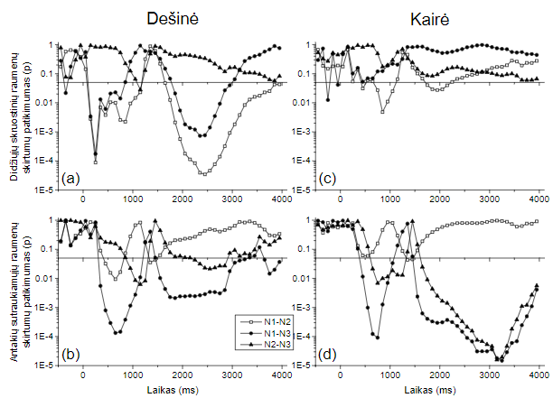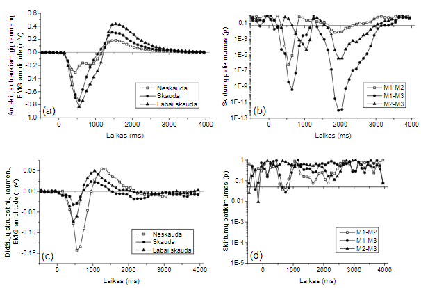 pusėse, asimetrija. Kairės veido pusės reakcija labiau išreikšta nei dešinės, maksimali amplitudė ties 800 ms (t(17) = 2,134, p < 0,05). Lygindami faktoriaus „Nutaiso veido išraišką“ trijų skausmo lygmenų skirtumų patikimumo įvertinimą dešinės veido pusės didiesiems skruostiniams raumenims, matome, kad tarp N1-N2 ir N1-N3 atsiranda patikimi skirtumai (p < 0,05) praėjus 200 ms po vaizdo pateikimo (2-as pav., a). O patikimi skirtumai dešinės veido pusės antakių sutraukiamiesiems raumenims atsiranda praėjus 400 ms po vaizdo pateikimo (2-as pav., b). Kairės veido pusės raumenims patikimi skirtumai atsiranda 100 ms vėliau nei dešinėje pusėje (2-as pav., c, d). Patikimas skirtumas tarp nutaisomų išraiškų reiškia, jog tam, kad atsirastų skirtumas tarp EMG reakcijų, tiriamajam prieš tai reikėjo vienu atveju suvokti vieną, o kitu atveju – kitą skausmo išraišką. Taip pat galime išskirti du laiko intervalus, kuriuose pasireiškia patikimi skirtumai tarp faktorių lygmenų. Pirmame laiko intervale skirtumai prasideda ties 200–400 ms (priklausomai nuo raumens) po stimulo pateikimo ir tęsiasi 1 300 ms. Antrajame laiko intervale EMG skirtumai atsiranda apie 1 600 ms po stimulo pateikimo. Didžiųjų skruostinių raumenų reakcijose skirtumai išnyksta apie 3 100 ms, o antakių sutraukiamųjų raumenų – tęsiasi per visą mūsų nagrinėtą signalo laikotarpį, t. y. 4 000 ms.