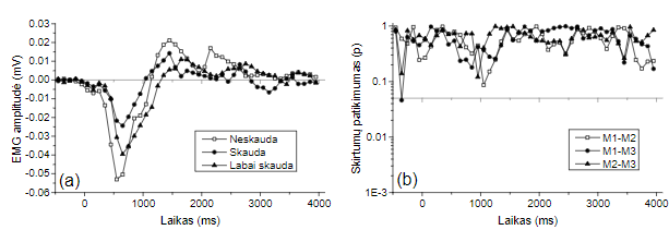 Suskaičiavus visų tiriamųjų reakcijų vidurkį, statistinio skirtumų patikimumo nenu- statyta. Iš faktoriaus „Mato“ lygmenų statistinio įvertinimo matome (3-ias pav., b), kad skirtumai tarp visų lygmenų faktoriaus priartėja prie patikimų skirtumų laiko intervale 1 400–1 600 ms, tačiau nesumažėja žemiau p = 0,05 ribos.