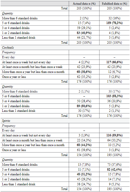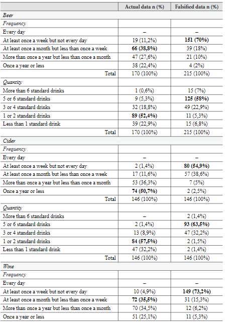 Table of actual and falsified data on different beverages’ drinking frequency and quantity.