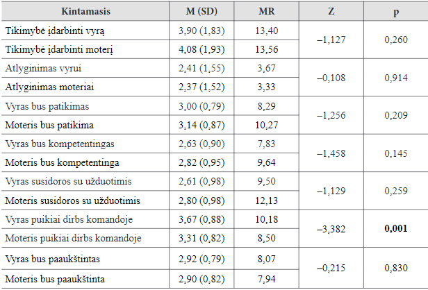 Toliau buvo siekiama įvertinti, kaip tyrimo dalyvės (personalo specialistės ir palyginamosios grupės moterys) vertina kandidatų (vyro ir moters) įdarbinimo tikimybę. Pritaikiusios Manno ir Whitney kriterijų gavome, kad palyginamosios grupės moterys tiek kandidato vyro (p < 0,001), tiek kandidatės moters (p < 0,001) (5-a lentelė) įdarbinimo tikimybę vertino kaip reikšmingai didesnę, palyginti su personalo specialistėmis. Tai reiškia, kad personalo specialistės yra griežtesnės vertindamos kandidatus į vadovaujamą poziciją.