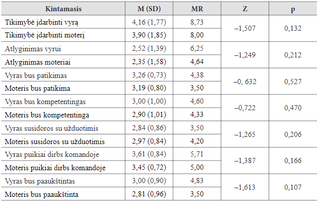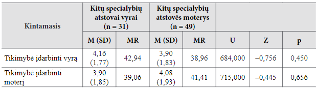 Tokia pati procedūra buvo taikyta siekiant patikrinti, ar kitų specialybių atstovų vyrų ir moterų grupes galima laikyti lygiavertėmis pagal amžių bei išsilavinimą. Nustatyta, kad palyginamosios grupės vyrai ir moterys tarpusavyje nei pagal amžių (p = 0,761), nei pagal išsilavinimą (p = 0,468) nesiskiria.
