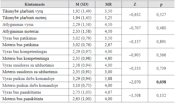 Norint patikrinti, ar pasireiškė visų tyrimo dalyvių grupių (personalo specialisčių, kitų specialybių atstovių moterų ir kitų specialybių atstovų vyrų) diskriminacija moterų atžvilgiu, t. y. ar jos buvo labiau linkusios įdarbinti kandidatą vyrą nei moterį, buvo atliktas Wilcoxono testas (1-a, 2-a ir 3-ia lentelės). Rezultatai parodė, kad kandidato vyro ir kandidatės moters įdarbinimo tikimybė nesiskiria nė vienoje tyrimo dalyvių grupėje. Nebuvo rasta statistiškai reikšmingo skirtumo ir tarp vyrui ir moteriai skiriamos algos, paaukštinimo galimybių, patikimumo, kompetencijos bei gebėjimo susidoroti su visomis užduotimis. Vienintelis statistiškai reikšmingas skirtumas buvo rastas tarp kandidatų darbo komandoje – personalo specialistės (p = 0,038) ir kitų specialybių atstovės moterys (p < 0,001) manė, kad vyrui geriau pavyks dirbti komandoje nei moteriai.