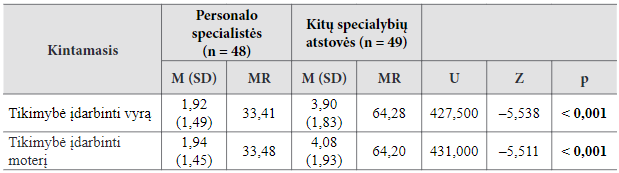 Visų pirma buvo nuspręsta patikrinti, ar personalo specialisčių ir kitų specialybių atstovių moterų grupes galima laikyti lygiavertėmis pagal amžių bei išsilavinimą. Tam buvo taikytas Manno ir Whitney kriterijus. Buvo nustatyta, kad personalo specialistės yra šiek tiek vyresnės (p < 0,001) ir pasižymi aukštesniu išsilavinimu nei palyginamosios grupės atstovės (p = 0,008). (Taigi toliau analizuojant rezultatus svarbu turėti omenyje, kad kitus gautus skirtumus tarp šių grupių ar jų nebuvimą galėjo lemti ne tai, kad vienos moterys dirba personalo specialistėmis, o kitos – ne, bet tai, kad vienos moterys yra vyresnės ir turi aukštesnį išsilavinimą nei kitos.).