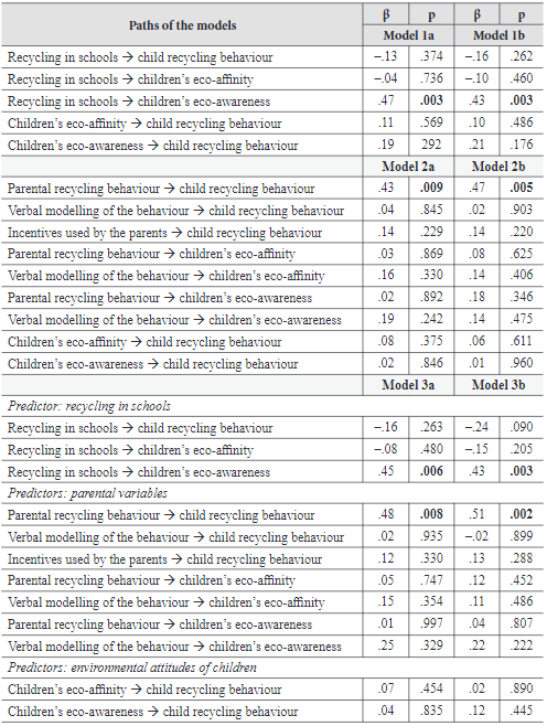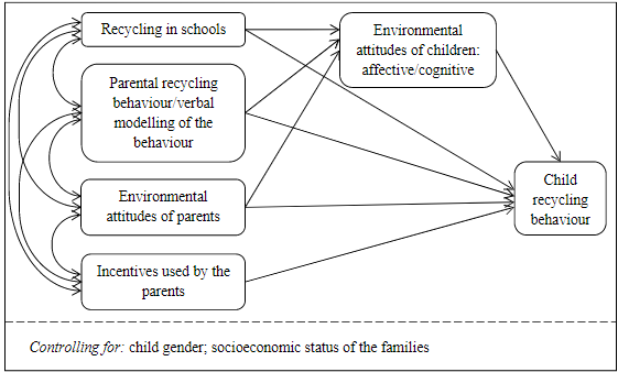 Abstract: This study aimed to investigate the relationship between environmental attitudes and recycling behaviour in primary school age, and to evaluate the role that school and parents play in the prediction of children’s attitudes and behaviour. Primary school pupils aged 8–11 years (. = 116), their parents and their class teachers participated in the study. During the structured face-to-face interviews, children answered questions about their recycling behaviour and environmental attitudes (i.e. eco-affinity and eco-awareness). Parents provided answers on their recycling behaviour, verbal modelling of the behaviour, incentives used when a child recycles waste, and environmental attitudes, while class teachers provided information about the recycling in children’s school. Structural equation models were tested with a purpose to evaluate the role of different independent variables, i.e. only school, only parental factors, or both, when predicting child recycling behaviour. Results of the study showed that children’s environmental attitudes had no significant links to their recycling behaviour. The only factor that appeared to be significant in the prediction of child behaviour was parental recycling behaviour. Furthermore, recycling in schools predicted pupils’ eco-awareness. Based on the study findings, it would be worthwhile to promote more practical training of pro-environmental behaviour, and to strengthen children’s eco-affinity.