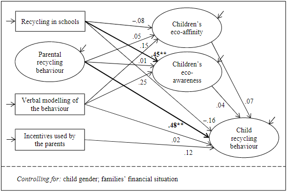 mental attitudes of children were not a significant predictor of their recycling behaviour. The findings though revealed that parental recycling behaviour predicted the corresponding child behaviour, while recycling in schools proved to be a significant predictor of pupils’ eco-awareness. The results from the final general research model (i.e. model 3b) can be seen in Figure 2.
