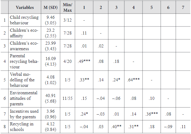 Descriptive statistics and Spearman’s correlations between study variables are presented in Table 1. Means of the variables ranged from moderate to high. Child recycling behaviour correlated with the respective parental behaviour (r = .49, p < .001), verbal modelling of the behaviour (r = .33, p = .001) and incentives used by the parents (r = .24, p = .019), but did not relate with children’s eco-affinity (r = .11, p = .440) or their ecowareness (r = .01, p = .959). Furthermore, children’s eco-awareness correlated with verbal modelling of recycling behaviour by the parents (r = .24, p = .038) and with recycling in schools (r = .40, p = .004). Considering that no significant correlations were found between environmental attitudes of parents and other study variables (see Table 1), parental attitudes were removed from the further analysis.