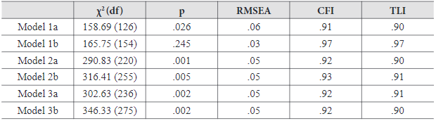 Model fit of SEM models was assessed with chi-square test statistic (χ2), root mean square error of approximation (RMSEA), comparative fit index (CFI) and Tucker-Lewis index (TLI). RMSEA below .06 and CFI/TLI above .95 are recognized to indicate good model fit (Hu & Bentler, 1999). RMSEA below .08 (Hooper et al., 2008) and CFI above .90 (Raykov & Marcoulides, 2006) are also associated with models of acceptable fit. Separate models with and without the control variables were compared using chi-square difference test (Hoyle & Panter, 1995). Moreover, modification indices were used when necessary and when coincided with theoretical assumptions.