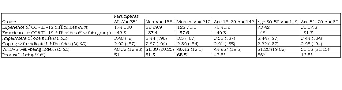 Almost 60% of all female respondents (70.1% of the total sample) experienced difficulties related to COVID-19 (Table 1). The proportion of women who reported any difficulty was significantly larger compared to men (χ² = 13.62, df = 1, . < .001). Women’s WHO-5 index was significantly lower (. = 2.32, df = 349, . = .021), and the larger proportion of women had poor well-being (χ² = 10.01, df = 1, . = .002) in comparison with men, see Table 1. The severity of the difficulties and the ability to cope with them successfully did not differ between genders and age groups. Almost the same proportion (49% to 51.7%) of respondents from three different age groups experienced COVID-19 difficulties. However, the results revealed group differences in well-being. The mean score of WHO-5 of young adults (aged 18–29) was significantly lower than in other age groups (. = 4,49, df = 2, . = .012; Bonferroni 1>2, 1>3, . < .05). Although there were no significant differences in WHO-5 between the rest of the age groups, the proportions of respondents with poor well-being significantly differ among all age groups (χ² = 8.48, df = 2, . = .014), see Table 1.