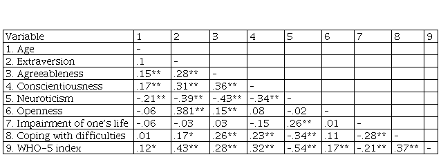 Participants were provided with an open-ended question to name the three greatest difficulties encountered during the quarantine. They were asked to rate each of their identified difficulties using a 5-point Likert type scale to mark how much the difficulty impaired one’s life (from 0 ‒ not at all to 5 ‒ very much) and how successfully they could cope with the difficulty (from 0 ‒ completely unsuccessfully to five = very successfully). The severity of impairment was calculated, scoring the average from indicated difficulties (the total score ranges from 0 to 5). Cronbach’s alpha for these items is .60. The score for coping with difficulties was calculated by averaging all the scores of the perceived ability to cope with the difficulties (the total score ranges from 0 to 5). Cronbach’s alpha is .63. Current mental well-being was measured by the WHO-5 Well-Being Index (WHO-5; Psychiatric Research Unit, 1999). The total score ranges from 0 to 100, while well-being is considered poor when the index is ≤ 50 (Topp et al., 2015). Cronbach’s alpha for WHO-5 is .86. Personality traits were measured by using the Big Five Inventory (BFI; John, Naumann, & Soto, 2008). In this study Cronbach’s alpha are .79 (Extraversion), .68 (Agreeableness), .76 (Conscientiousness), .85 (Neuroticism), .69 (Openness).
