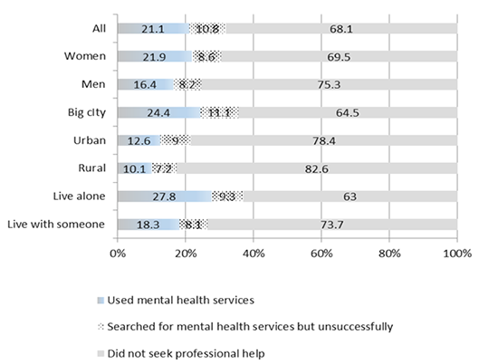 The lowest percentage of people who used mental health services were among those who lived in a rural or urban area (twice less often as those who lived in a big city). It is also important to note that women were more likely to seek mental health services than men. The highest percentage of those who used mental health services were among those living in big cities and those who lived alone (see Figure 2).