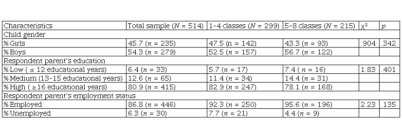 This research sample included data of the 514 children, aged 7 to 14 years old (mean age 10.15 years, SD = 3.47; 299 children attended primary school; 215 attended secondary school, see Table 1). Nearly ninety-six per cent (. = 497) of questionnaires were completed by mothers, 2.9 % (. = 15) by fathers, 0.4 % (. = 2) by other respondents (foster caregivers). The research sample somewhat over represents children from educated and low social economical risk families (see Table 1).